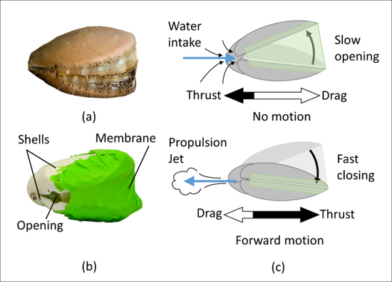 该机器人模仿了扇贝的设计,使用一对带有后部开口的铰链式阀门,允许水向后移动。内部的空腔由覆盖在前部的橡胶膜密封。这样,当机器人扇贝扣上时,所有水都必须通过这些后部的通风口。