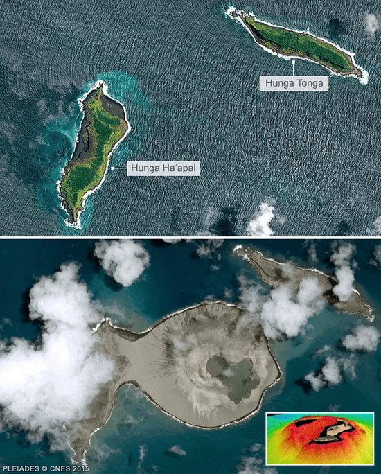 2015年,海底火山喷发使两个岛屿被联结在一起,形成洪阿哈阿帕伊岛。