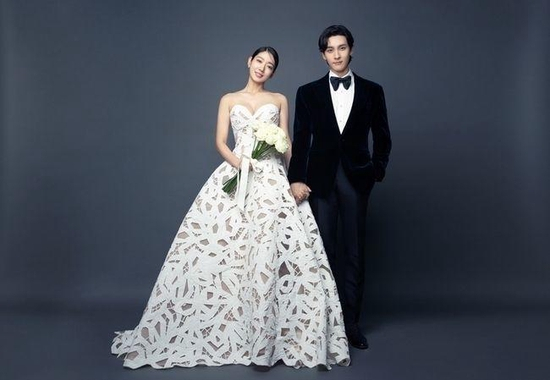 但这也不耽误大家为他们开心,婚礼前朴信惠的经纪公司就发布了好几张婚礼海报,照片中朴信惠穿着纯白色婚纱,捧着花束,身边的新郎崔泰俊则是穿着黑色燕尾服,美女俊男好登对。