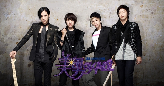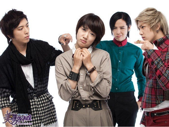 如果还有不太熟悉《美男》剧情的小伙伴,朴信惠在剧中是女扮男装的女主高美男,代替哥哥进入了一个人气男团,其中男团成员包括主唱黄泰京(张根硕饰演)、贝斯姜新禹(郑容和饰演)和鼓手Jeremy(李洪基饰演)。