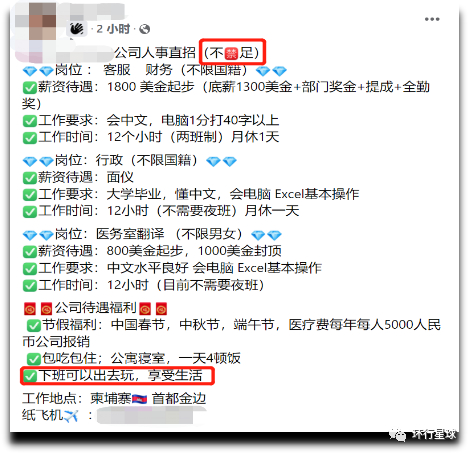 在国内外的招聘平台和各类人带人的介绍中,国外工作、签证机票全包 、园区环境、海景健身房、高端团建活动,都属于比较“高端”的标签。