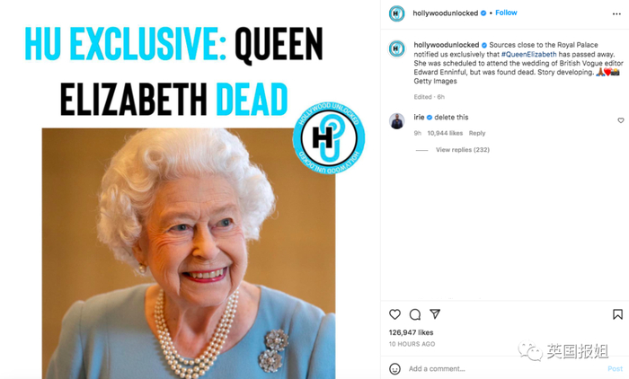 就在女王取消远程工作当天,美国一个名叫“Hollywood Unlocked解锁好莱坞”的社交媒体账号,在坐拥280万粉丝的页面上传了女王的“死讯”,标题非常耸动《解锁好莱坞独家:伊丽莎白女王死亡》。