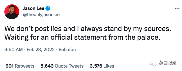 然而,“解锁好莱坞”的创建人Jason Lee很快在推上跟进,他说:“我们不发布谣言,我永远坚信我的消息来源。坐等白金汉宫的官方声明。”