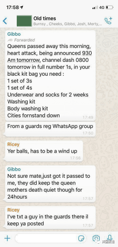 2019年12月初的一天,一张聊天截图在外网疯传,一位名叫Gibbo的用户在聊天群里发“通知”,表示女王在当天早晨因为心脏病发作离世,还说官方会在早上九点半公布消息,而他收到所在部队的通知,要带上葬礼活动相关的服饰和洗漱用品。