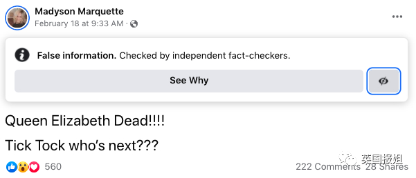 一次是去年11月,脸书上有人发了女王去世的悼念视频,标题用的《呼吸停止:威廉哭惨了,英国女王去世,享年95岁》。(离谱…)