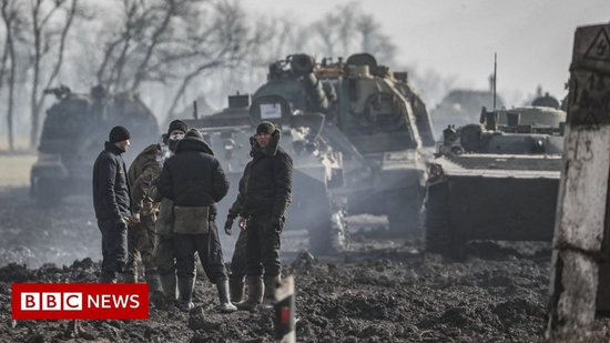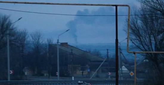 2月24日,顿涅茨克地区一座小镇冒起了浓烟(图/路透社)