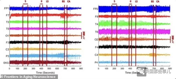 在病人死亡前后那段区域,他的大脑发生了一系列和神经有关的脑波振荡,其中有明显的gamma波振荡,也同时伴随着delta波,alpha波,beta波振荡。