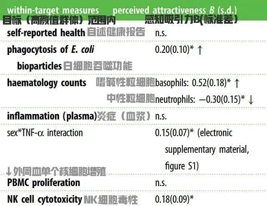 血检结果显示,面孔吸引力较高者的某些免疫功能表现非凡:白细胞吞噬功能、嗜碱性粒细胞数量、NK细胞毒性均高于其他被试者;中性粒细胞数量则偏低。