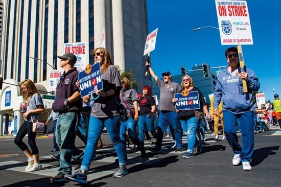 2021年10月16日,美国内华达州里诺,工会成员举行罢工。新冠疫情暴发近两年后,一场罢工浪潮正在全美机械、食品、医疗、娱乐等行业加速蔓延。