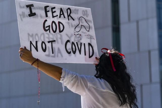 2021年9月18日,美国加州,女子举着写着反新冠疫苗口号的卡片站在市政厅前抗议。