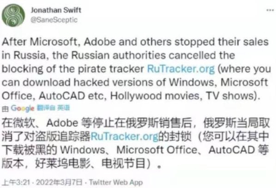 在面对微软、谷歌、甲骨文、苹果等科技巨头都宣布停止在俄罗斯的业务计划时,俄罗斯更是放了一个大招:解禁了一个叫做 RuTracker 的盗版资源网站。