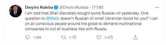乌克兰外交部长 Dmytro Kuleba 在推特上质问:俄罗斯石油闻起来是否像 " 乌克兰人的血?"