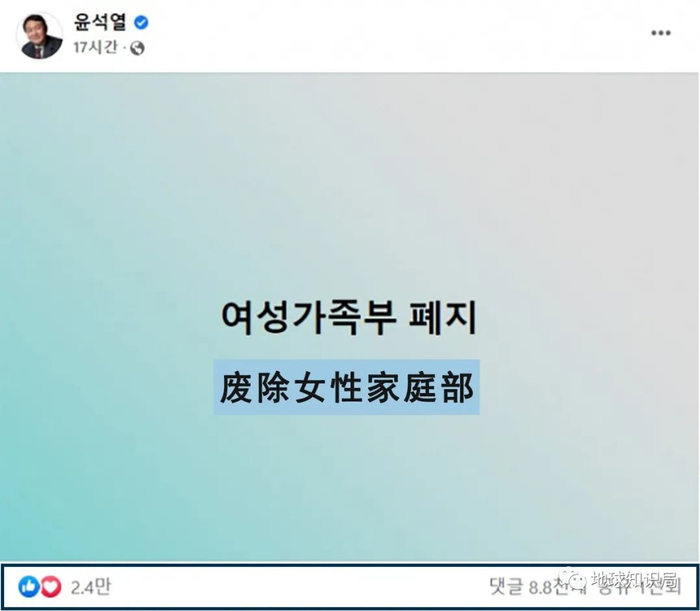 在距离韩国大选不久的1月7日,尹锡悦在自己的社交媒体账号上发布一则消息,主张废除保护女性权益的女性家族部。据民调显示,这一句话就让尹锡悦赢得了大量青年男性的选票。