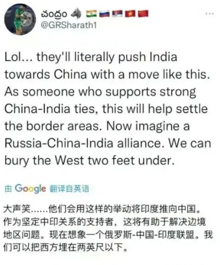 当拜登政府考虑制裁印度的时候,印度网友们民族情绪爆棚,高喊“印度不是美国的殖民地,美国佬闭嘴”,“打倒美帝国主义”,“印中俄团结起来”,“把西方给埋了”!