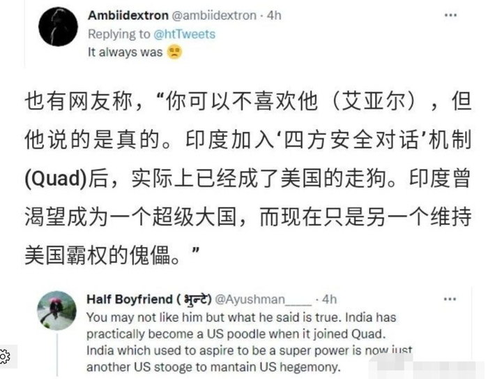 整个印度舆论发生了180度的转变,从上到下仿佛“如梦初醒”,“我们表现得就像是美国的奴隶。”印度国大党领袖马尼·尚卡尔·艾亚尔当地时间23日抨击印度人民党领导的中央政府称,2014年之后,印度已沦为美国的奴隶——而印度网友评价“我们从来如此”!愤懑不甘之情溢于言表。
