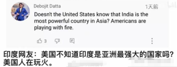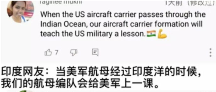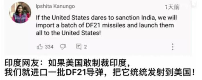 当然,也有更搞笑的言论,比如说“从中国进口东风21导弹,统统射到美国”,“尝尝印度航母编队的威力吧”,“美国佬不晓得印度是亚洲最强大的国家吗?美国佬你是在玩火!”.......