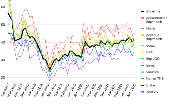 一项民调中,61%的选民认为马克龙有“威权”倾向,只有26%认为他“贴近人民的关切”。Odoxa今年2月初的另一项民调显示,62%的受访者对马克龙五年执政的成果给出了差评,过半数表示不希望他寻求连任;此外,74%的受访者认为他在打击犯罪方面没有达到要求。
