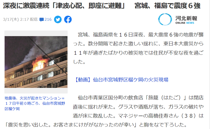 不仅国人小伙伴担忧,经过了311大地震,这次间隔数分钟的剧烈震荡使仙台的本地居民也度过了一个焦虑的夜晚。