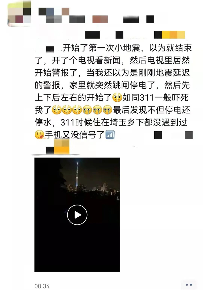 住在东京的小伙伴也描述了地震时停电的经过,“开始了第一次小地震,以为就结束了,开了个电视看新闻,然后电视里居然开始警报了,当我还以为是刚刚地震延迟的警报,家里就突然跳闸停电了,然后先上下后左右的开始了如同311一般吓死我了最后发现不但停电还停水......”