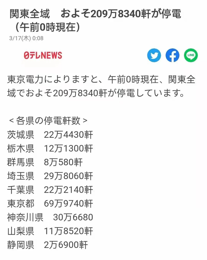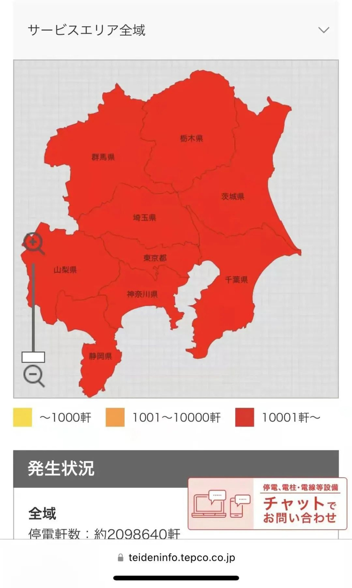 随即日本关东多地出现了停水停电。东京都、千叶县、神奈川县、埼玉县、茨城县、山梨县、静冈县、群马县、栃木县有超过209万户的家庭大规模停电。