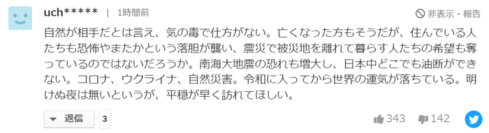 因为我们面对的是大自然,所以显得人类既可怜又没有办法。不幸去世的人也是如此,即使依然活着的人也在受到恐惧或失望的打击,因为这种情况再次发生,地震可能已经带走了那些远离灾区的人的希望。南海发生大地震的威胁正在增加,日本各地的人们都不能疏忽大意。疫情,乌克兰,自然灾害。自2022年初以来,世界的财富一直在下降。据说,没有一个夜晚是没有黎明的,但我希望平静和和平早点回到这个世界。