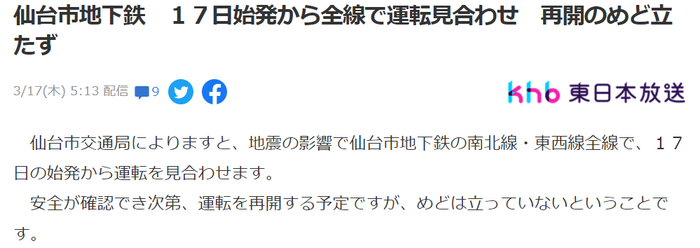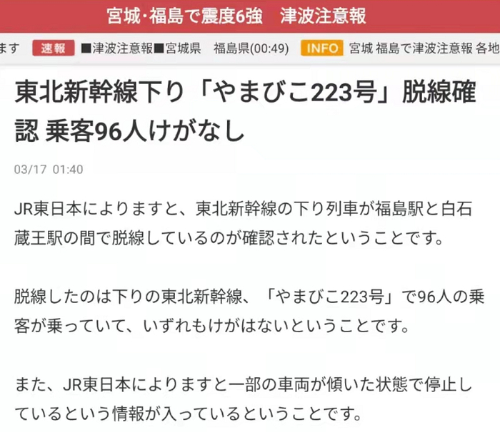 17日,仙台市的地铁停运。从东京开往仙台的东北新干线“やまびこ223号”也因为脱轨停在了高架轨道上。