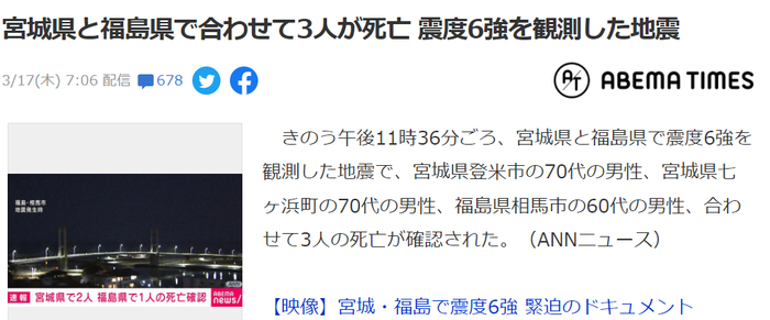 虽然大家都被吓得不轻,不过万幸的是,这次地震并没有引起海啸,死亡人数一共3人。分别是宫城县登米市一名70多岁的男性;宫城县七滨町一名70多岁的男性和福岛县相马市一名60多岁的男性。