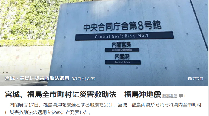 日本内阁办公室17日也宣布,《救灾法》适用于宫城县和福岛县受灾的全市町村,政府和各县将承担建立庇护所和供应食物的费用。