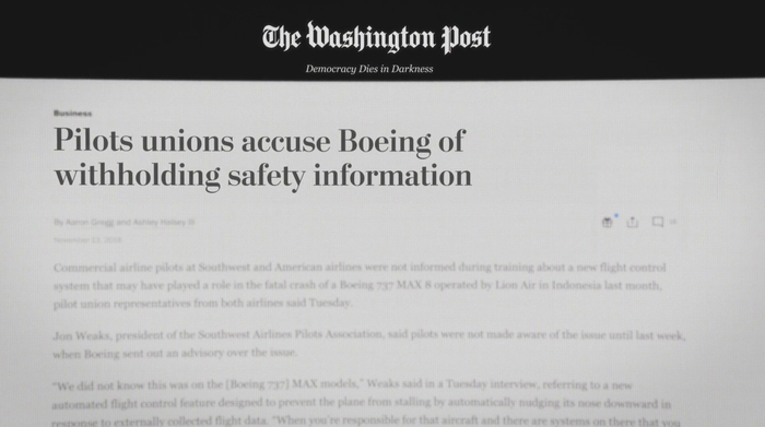 在波音内部的报告里明确写着,“该系统需要通过飞行员训练来识别失控情形”,但实际上他们卖出的每一架MAX机型都没有任何飞行员训练。飞行员只需要看一段宣传资料片,上机培训就算完成了。