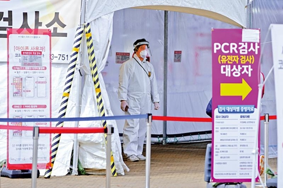 图:首尔医务工作者3月31日在临时检测站准备为市民服务。\美联社