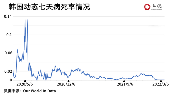 但从2月中旬至今,韩国7天动态病死率较为稳定,保持在0.1%左右。此前峰值为2020年5月4日的13.3%。