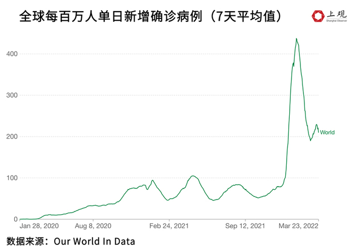 我们来回顾下这一波的数据:根据Our World In Data的数据,全球第四轮疫情在1月24日达到顶峰,单日确诊病例数超过345万人(7天平均值),为疫情两年来的最高值。在此之后,单日确诊数量开始下降,在3月3日下降至149万人。按照前几轮疫情的发展趋势,本轮疫情原计划将持续冷却,在4月中旬达到最低值,全球单日新增值稳定在30万例左右。
