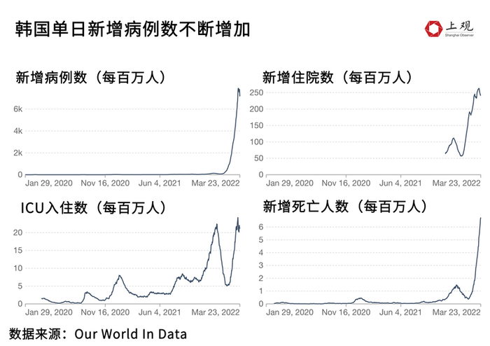 一些国家也可能面临短时间内死亡人数上升的情况,3月22日,韩国单日新增死亡人数已达到345人(7天平均值),为2年疫情的最高值,且处于上升趋势。