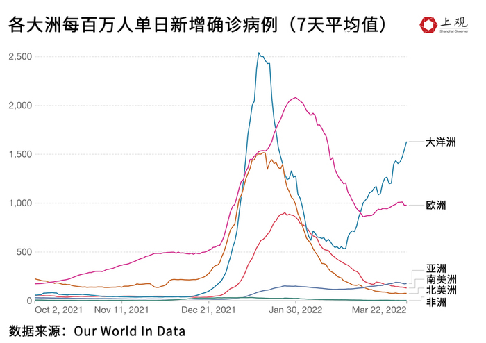再来看看曲线掉头向上的。大洋洲是目前情况最严峻的,新增确诊病例数处于快速上升阶段。在3月22日,每百万人中新增确诊数量为1630人,而此前峰值为2540人(1月13日)。