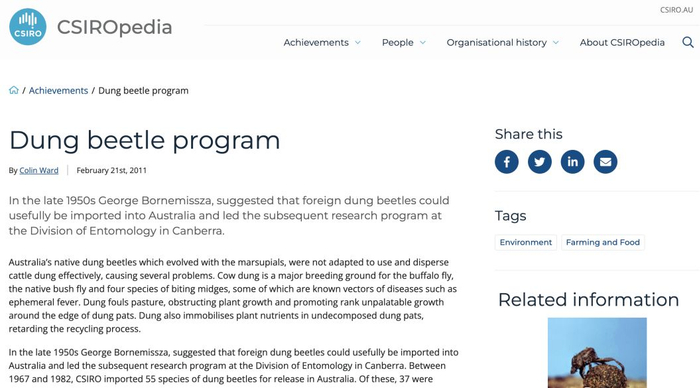 20世纪70年代,澳大利亚联邦科学与产业研究组织针对日益严重的牛粪危机,专门发起了一项“澳洲屎壳郎项目”(Australian Dung Beetle Project)