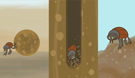 在远离竞争者的同时,雌性屎壳郎会跳上粪球表示选中了雄性来交配,然后夫妻两一同把粪球推入挖好的洞穴中,雌性在粪球开始产卵。
