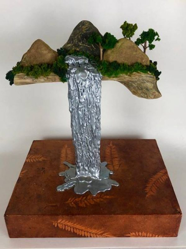 下面这个骨灰盒不需要挂在墙壁,也能漂浮在空中,只不过瀑布成了金属色: