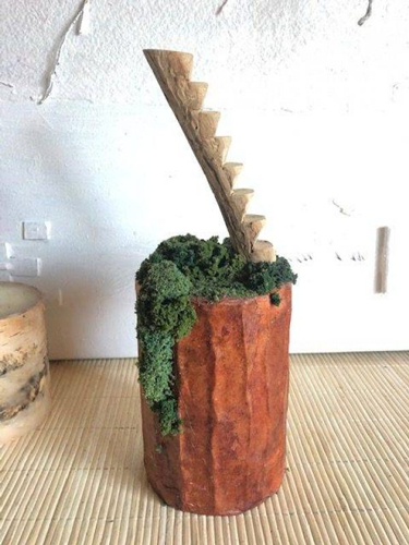 也可以用岩石作为基底,把榆树手工雕刻成楼梯,制作一个与自然景色很搭的骨灰盒,放在户外。