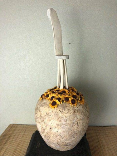 虽然还是在罐子里,但罐子上面多了一丛向日葵,向日葵中间放着一把椅子。死后坐在花丛中晒太阳,给人感觉很阳光: