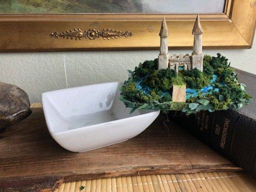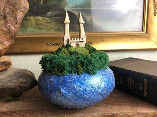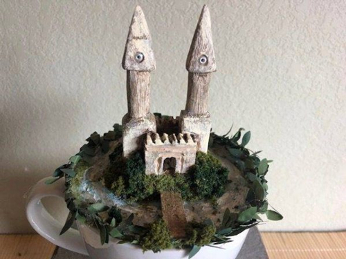 下面这个城堡也很有特点,因为它把骨灰盒本体也融入到了风景当中。蓝色的罐子就像是湖水,湖水中心则是草地与城堡。