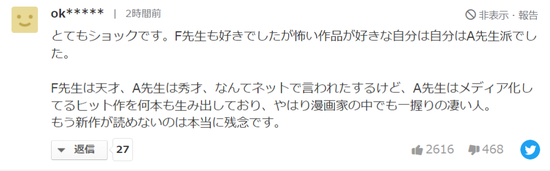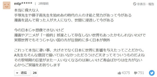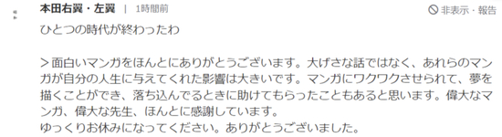 “一个时代结束了。→真的真的感谢您给我们带来那些有趣的漫画。不夸张地说,那些漫画给我的人生带来了巨大的影响。它们曾让我满怀激动、为我描绘梦想,在低落时给我帮助。伟大的漫画、伟大的漫画家,衷心感谢您!接下来,请好好休息吧,谢谢。”