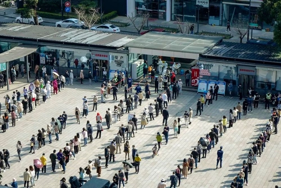 2022年3月11日,杭州城西某核酸检测点排起长队,市民有序间隔排队进行核酸检测。(ICPhoto 图)