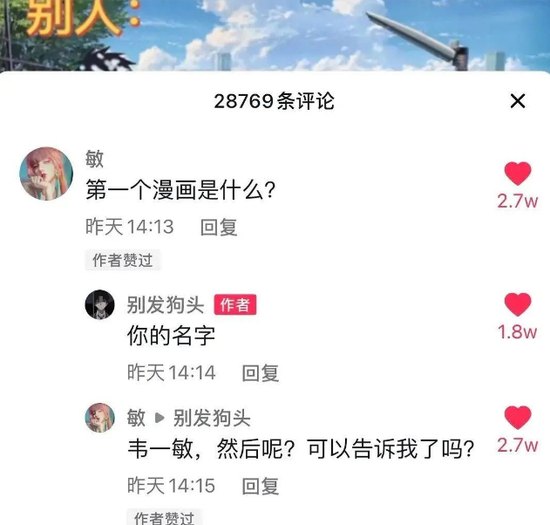 韦一敏的走红,起始于去年夏天短视频平台上的一条评论。在一个讲解《你的名字》动画电影视频的评论区里,一位ID为“敏”的网友和其他网友一样发出言简意赅的疑问,一位网友也同样言简意赅的回答了她。