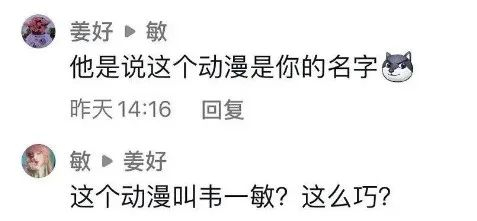 显然,“敏”将这里没加书名号的“你的名字”理解错了,随即报出了自己日后影响甚远的大名。直到另一位网友向“敏”解释道《你的名字》是视频所介绍的动漫名称时,“敏”的思维似乎依旧没有掰回来,并发出了惊讶的感慨:原来它也叫《韦一敏》啊!
