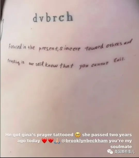 今年1月,布鲁克林又在身上文了Gina曾经的祈祷词。