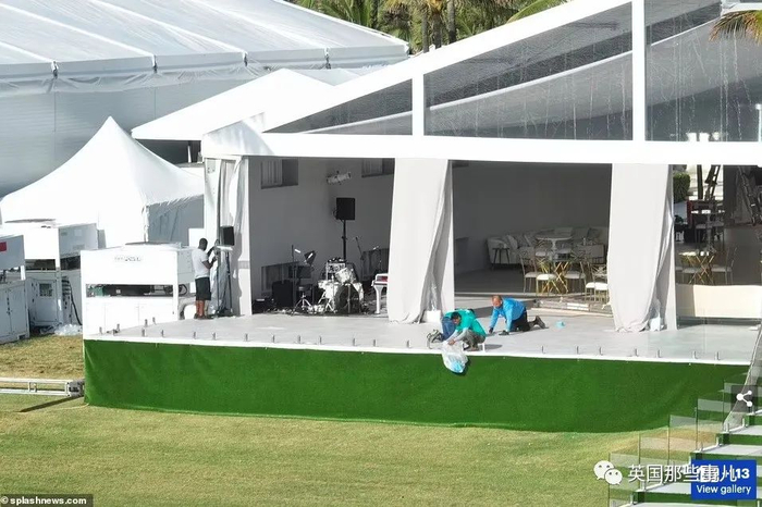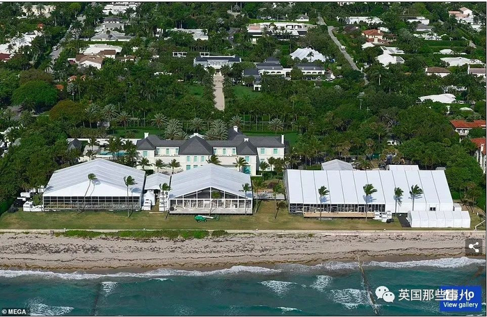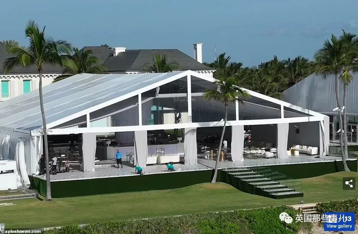婚礼地址位于美国佛州棕榈滩,女方家价值7600万英镑的大豪宅草坪上搭建起了3个巨大的白色帐篷。