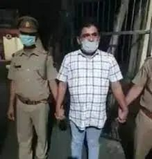 印度黑帮维卡斯·杜贝在乌贾因的 Mahakal 寺庙被捕,被北方邦警察挽着手臂带往坎普尔出庭。