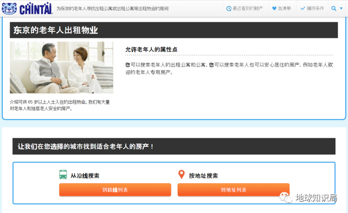 而近年来独居老人的问题,也得到了一定关注,在日本CHINTAI等租房网站上,也设置有老年人公寓页面,供用户选择。