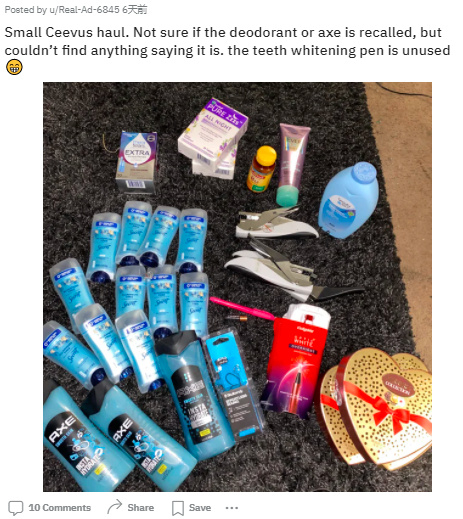 她们在Reddit帖子中发布的战利品,主要集中于化妆品和食物,除了临期和大都是赠送的小样之外,算下来比黑五拥有更大的折扣。