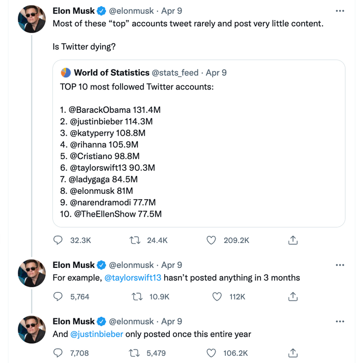 4月9日,在放弃加入董事会当天,他转发了一条罗列了粉丝最多的十大推特账号,表示其中有些人都不咋发推了,活跃度很低,例如泰勒·斯威夫特已经三个月没有发布任何消息了,而贾斯汀·比伯今年只发过一条推文。推特要完了?